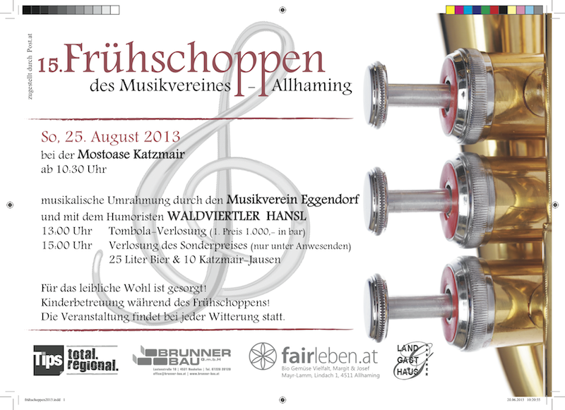 Am Sonntag den 25.08.2013 fand bei der Mostoase Katzmair der 15. Frühschoppen des Musikvereins Allhaming statt. Obwohl im heurigen Jahr der Wettergott den Mitgliedern des Musikvereins nicht gelinde stimmt war, konnte sich der Musikverein trotzdem über einen ausgezeichneten Besuch unter den erschwerten Bedingungen freuen.